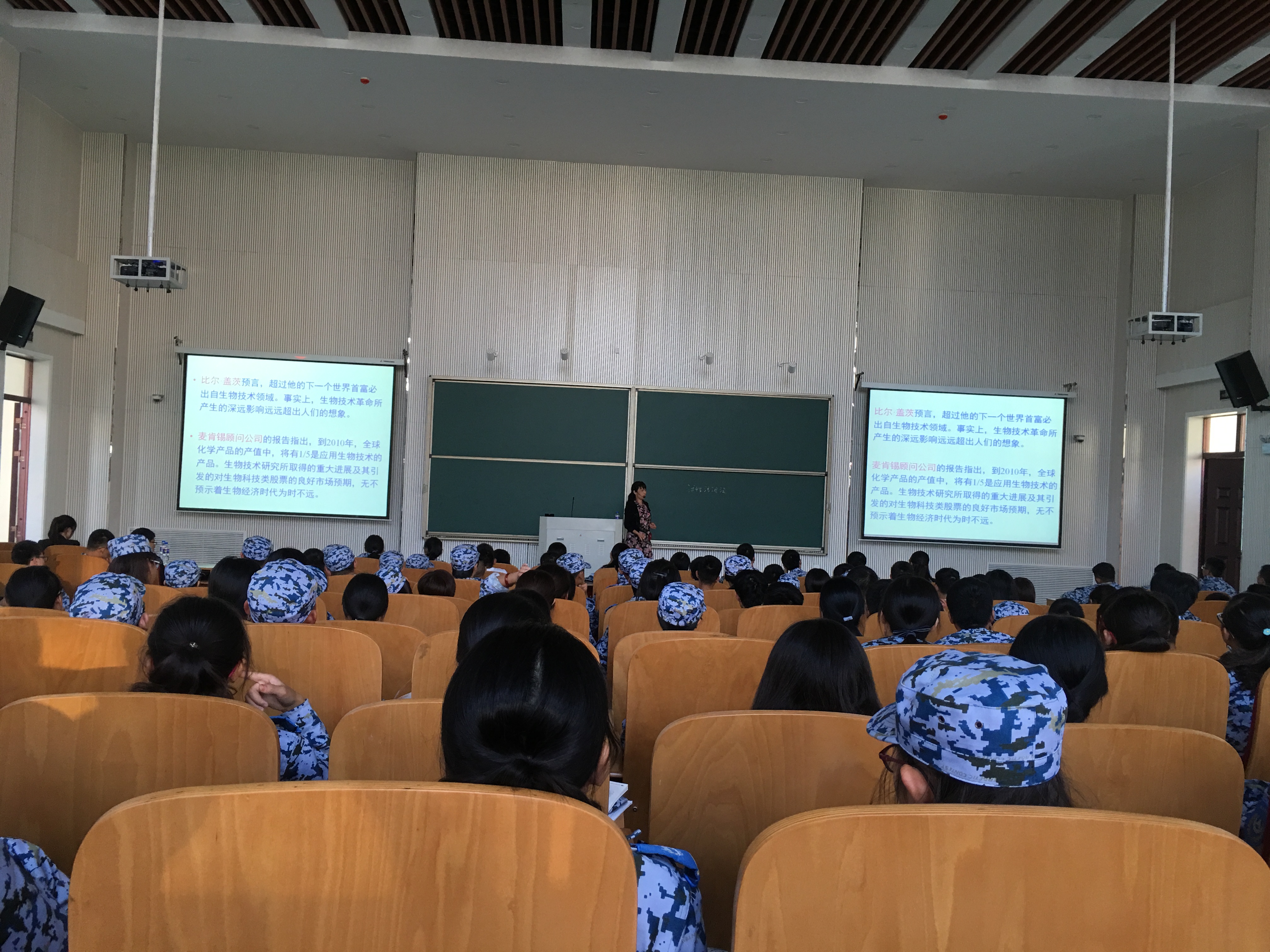 的科研成果和生化系的各位老师以及实习情况等,随后陈老师希望新生们可以在大学生活里做到“身体强壮-身体好、性格健全-情商高、能力超群-能力强”。最后,陈老师希望新生们可以学会自我管理、自我约束,在大学里能收获颇丰。生物科学专业是由袁志良老师介绍,首先,袁老师强调了大学生活的重要性,要定好自己的目标。随后,袁老师向新生们讲述了当今社会中的就业问题和生物科学的就业前景。三位老师在大会中的讲解条理清晰,都结合了各专业在实际生活中的应用,新生们在大会上认真听讲并做了笔记。会议最后,进行了老师与学生的互动环节,老师们细心为新生们解答疑问,使新生们更好的了解了自己的专业。