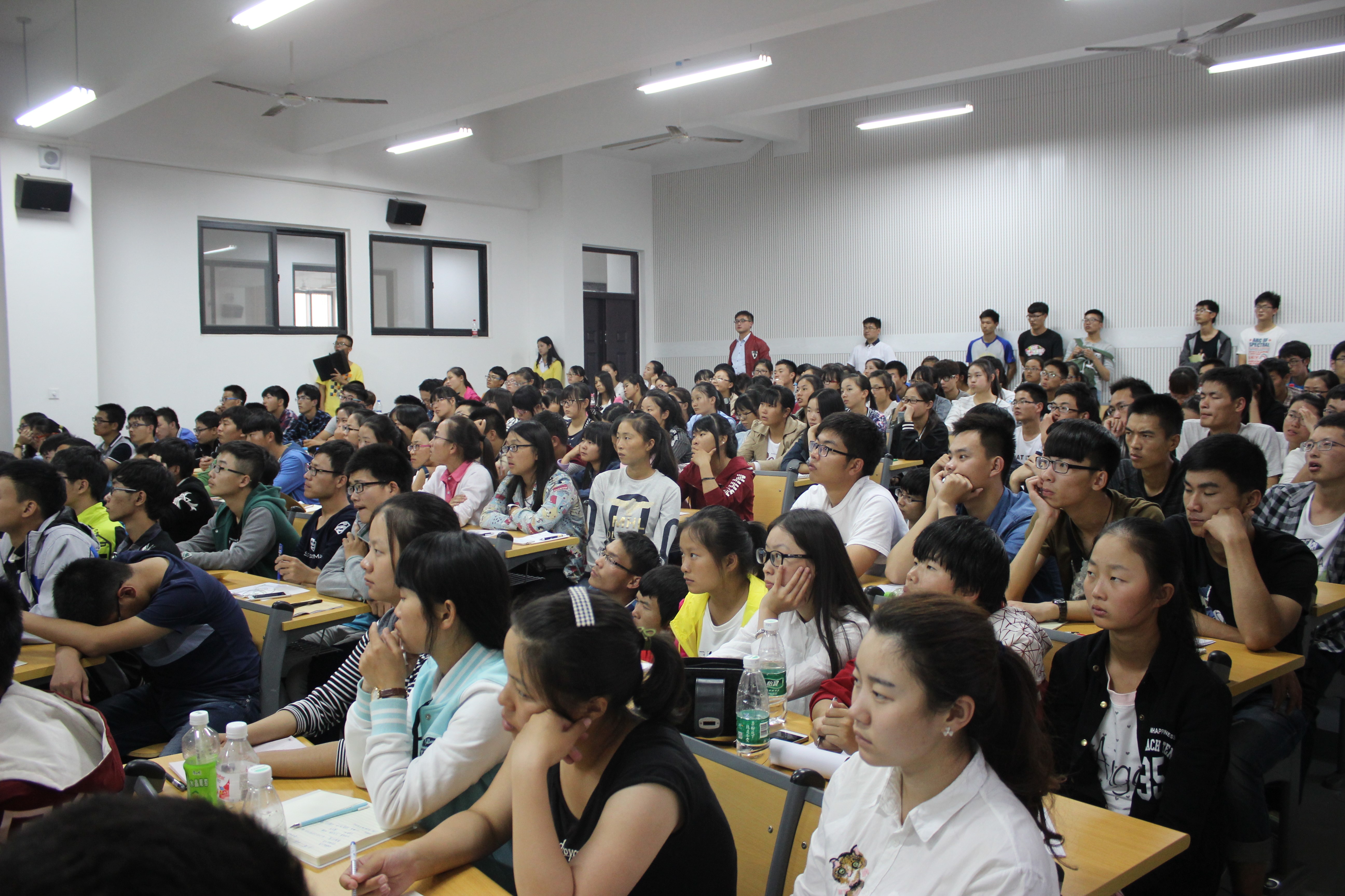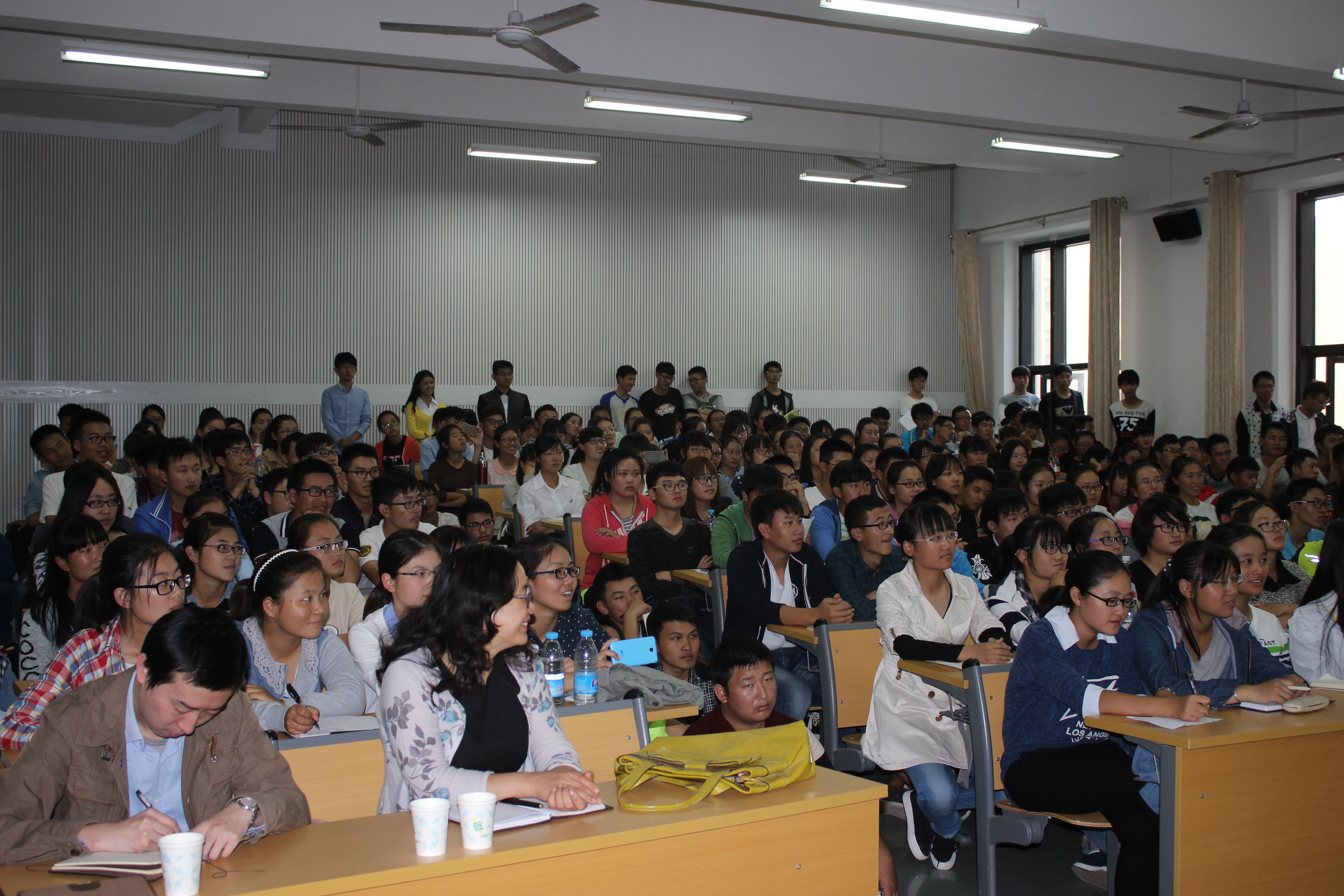 报告会现场座无虚席,同学们甚至坐在地上、站在教室走道上听完了两个多小时的报告会,报告会深入浅出,旁征博引,充满激情,赢得同学们阵阵掌声。