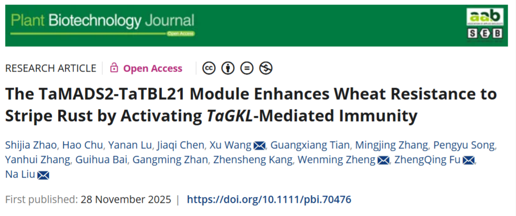 近日,我院刘娜教授团队在《Plant Biotechnology Journal》上发表了题为“The TaMADS2-TaTBL21 Module Enhances Wheat Resistance to Stripe Rust by Activating TaGKL- Mediated Immunity”的研究论文。该研究首次揭示了TaMADS2-TaTBL21-TaGKL功能模块形成的免疫调控通路。该通路通过协同促进水杨酸(SA)与甘油-3-磷酸(G3P)等核心防御代谢物的积累,从而系统性增强小麦对条锈病的抗性。该发现不仅解析了小麦抗条锈病的新机制,同时为作物遗传改良提供了优异基因资源与分子靶点。