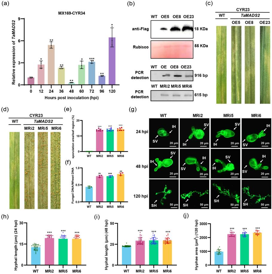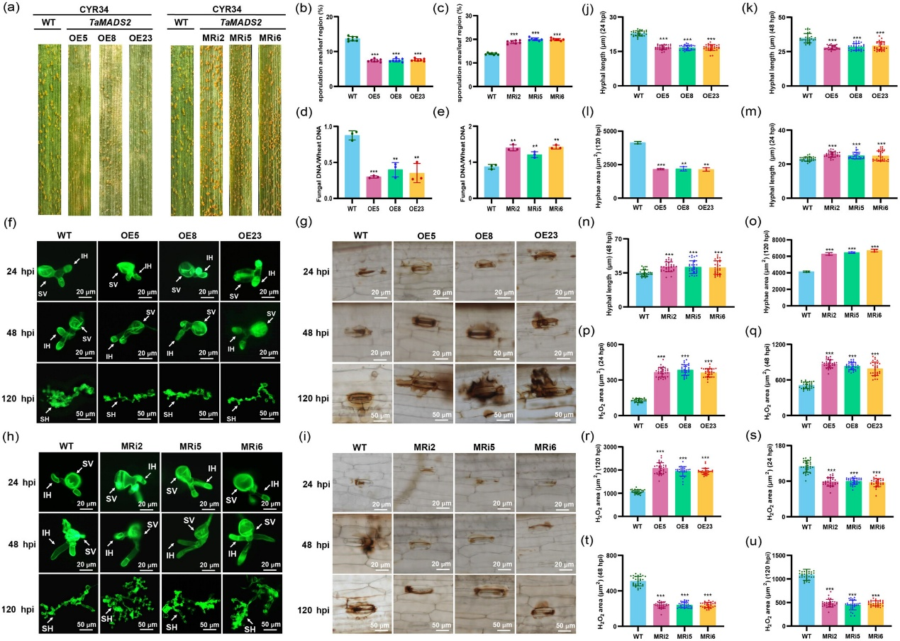 TaMADS2在条锈菌侵染早期表达显著上调,提示其可能参与寄主对病原的早期免疫应答(图1a)。过表达TaMADS2显著增强对CYR23与CYR34的抗性,表现为孢子堆减少、H2O2积累增强、菌丝生长抑制;而沉默株系则感病性显著增强(图1-2)。上述结果表明,TaMADS2作为正向调控因子,参与小麦-Pst互作过程。