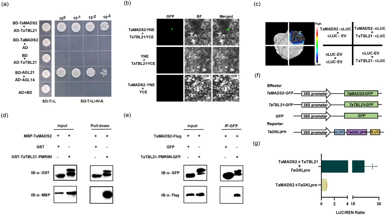 TaMADS2与TaTBL21在体内外均存在相互作用。酵母双杂交、双分子荧光互补、Pull-down及Co-IP等多种方法验证了这一互作关系(图7a-e)。进一步功能分析显示,TaMADS2与TaTBL21共表达能够协同增强下游基因TaGKL的转录(图7f),表明两者共同构成一个增强TaGKL表达的调控复合体。