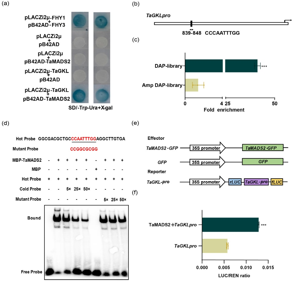 图5. TaMADS2直接结合TaGKL的启动子并激活其转录