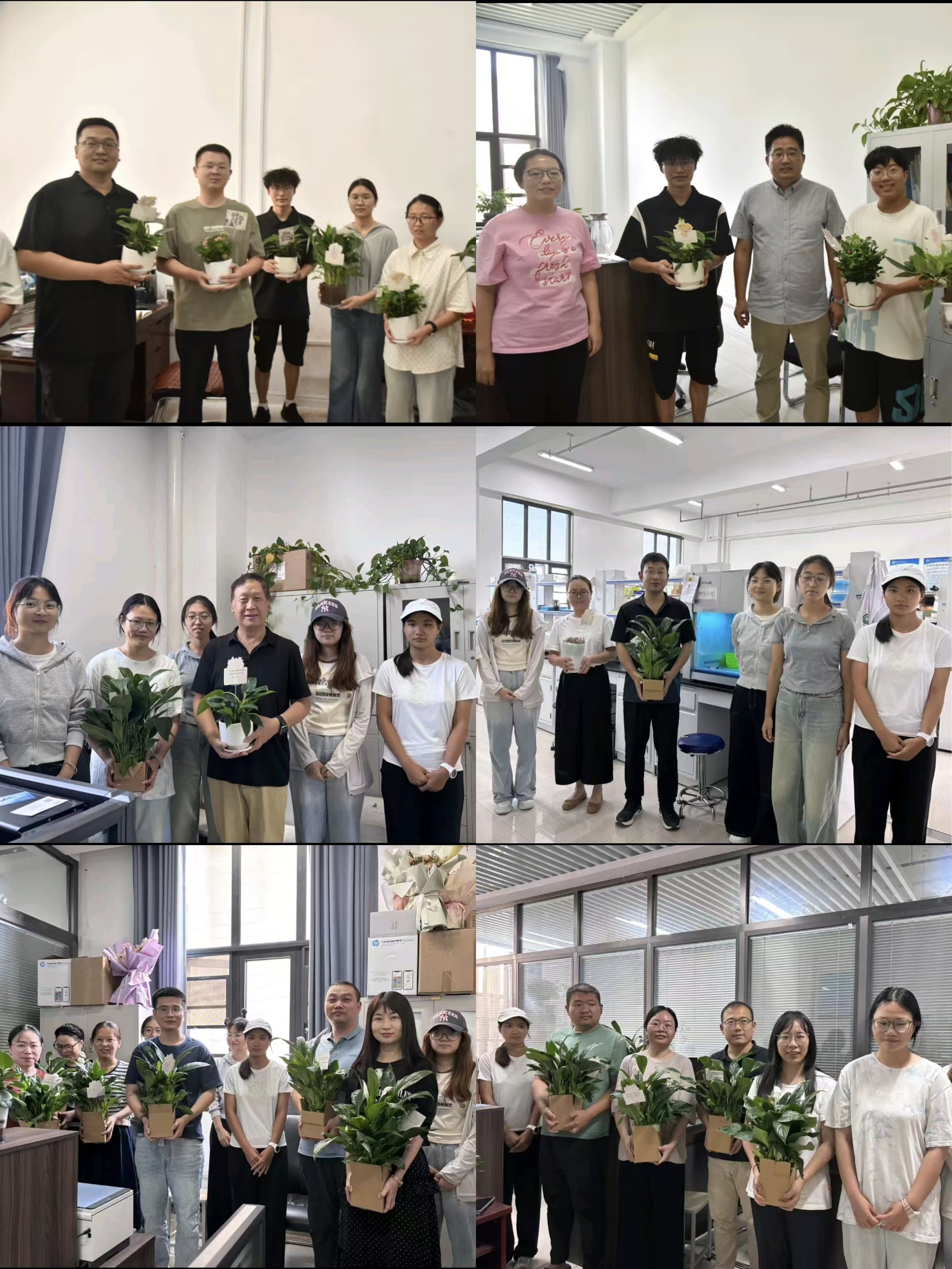 接着,学院各系工会组长带领学生代表前往各系老师办公室开展以“喜迎教师节,绿植映满院”为主题的教师节献花活动。学生们亲手将绿植和贺卡送至老师手中,并与老师亲切交流。
