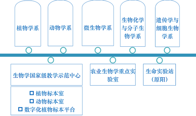 学院现设植物学、动物学、微生物学、生物化学与分子生物学、遗传与细胞生物学5个系和1个国家级生物学实验教学示范中心;有生物学河南省一级重点学科(涵盖11个二级重点学科);有生物科学(一本)、生物技术(一本)、生物工程(一本)等三个本科专业;其中生物工程专业获批国家级一流本科专业建设点、河南省高等学校专业综合改革试点专业,入选教育部首批“拔尖创新型”卓越农林人才培养模式改革项目;生物技术专业获批河南省一流本科专业建设点,是河南省特色专业、河南省高等学校专业综合改革试点专业;生物科学专业获批河南省一流本科专业建设点。在校博士、硕士研究生375人,本科生1434人。
